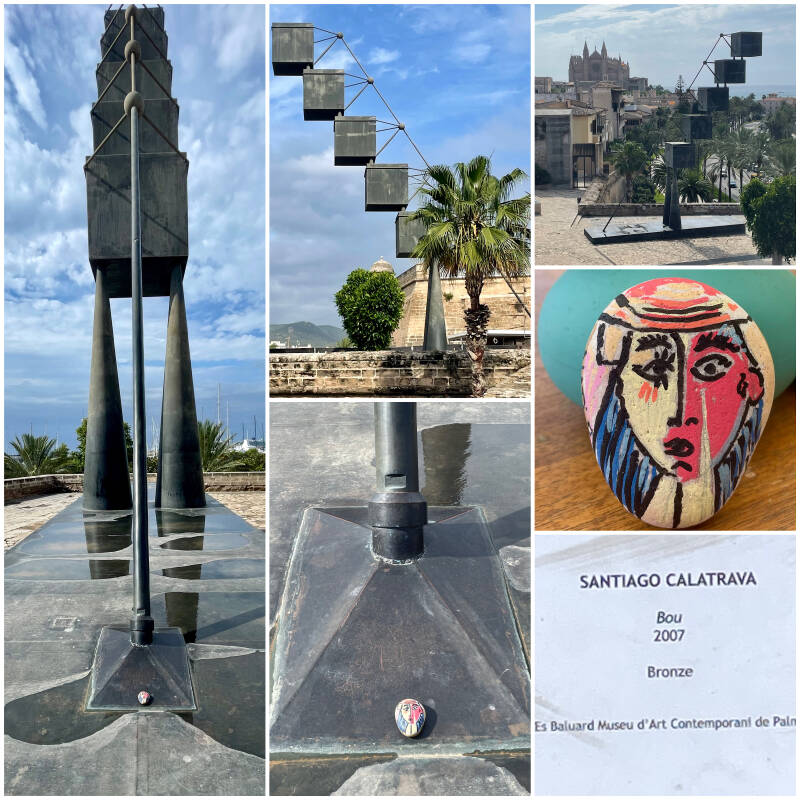 It took a while for my second painted hiking stone Picasso to find its way. It's my first trip without my love and it takes me to the Balearic Islands. The first three days belong to the beautiful city of Palma de Mallorca, called La Ciutat by the Mallorcans. Here in front of the museum Es Baluard, built as a new building within an old fortification of the Renaissance city wall, stands Santiago Calatrava's bronze sculpture Bou from 2007. And at the foot of the attachment of the seemingly floating cubes lies the painting modelled on Picasso's 'woman with hat'.