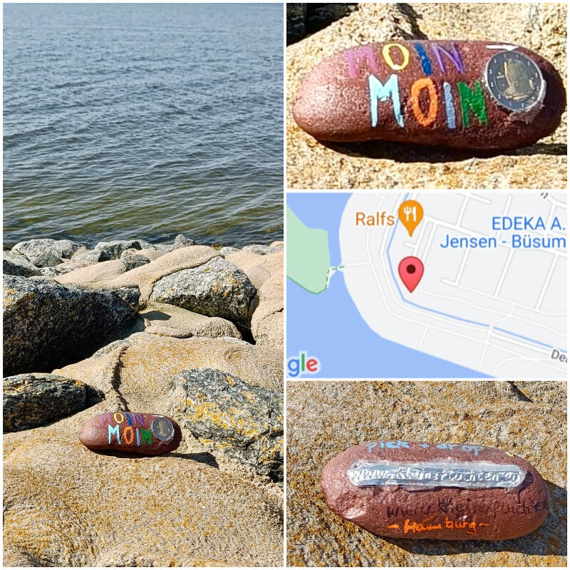 This typical greeting Moin Moin, already considered talkative in northern Germany, immortalised on Jessy's traveling stone together with a coin of the Hamburg's Elbphilharmonie, invites everyone to answer. This is how the stone on Büsum beach is chilling in the wonderful Whitsun. Fortunately, there is no storm tide to fear! Jürgen would now probably also sit on the stones and unwind, maybe eat a crab roll or a plaice Büsum Style.